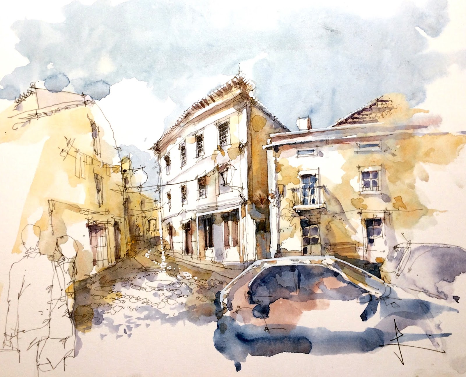 Estava complicado arrancar nesta manhã de Sábado numa cidade de Torres Vedras completamente invadida por aguarelistas de todas as partes do mundo e nós de caderno/bloco na mão como complemento desta simbiose. Depois de um café lá comecei com este desenho que foi um demo para um dos participantes que não queria desenhar, ficando apenas a ver e aprender. À medida que ia desenhando ia explicando o porque de eu fazer de uma forma e não de outra, bem como truques de medição do espaço para aplicarmos ao nosso desenho. Por fim, a regra mais importante: Não desenhar apenas nos encontros...
